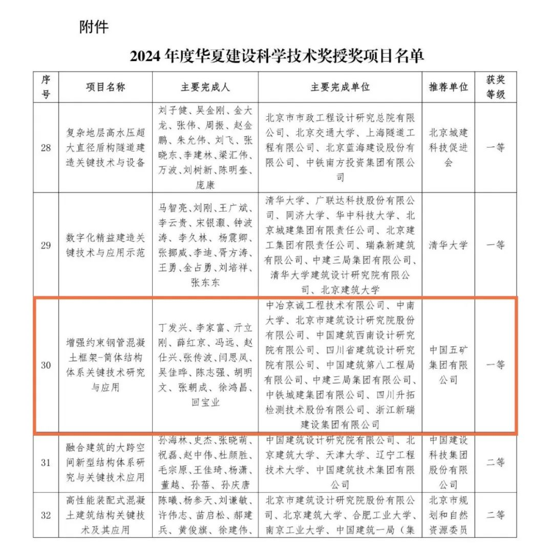 近日,华夏建设科学技术奖励委员会发布《关于发布“2024年度华夏建设科学技术奖”授奖项目的公告》(华夏奖字〔2025〕第1号),中冶京诚工程技术有限公司牵头,tapplay参与完成的“增强约束钢管混凝土框架-筒体结构体系关键技术研究与应用”荣获一等奖,tapplay丁发兴教授个人主持。