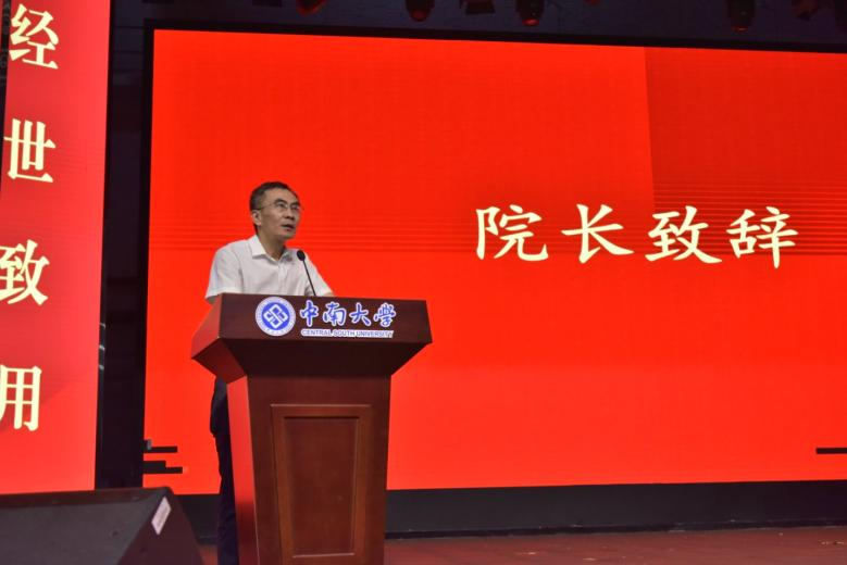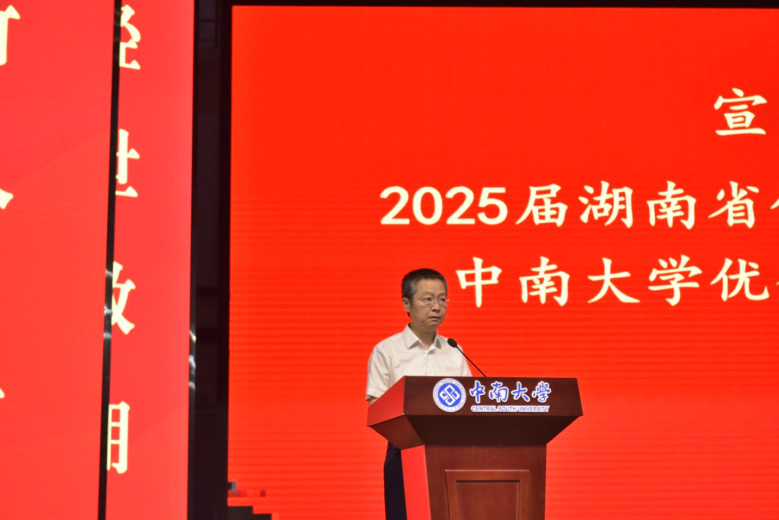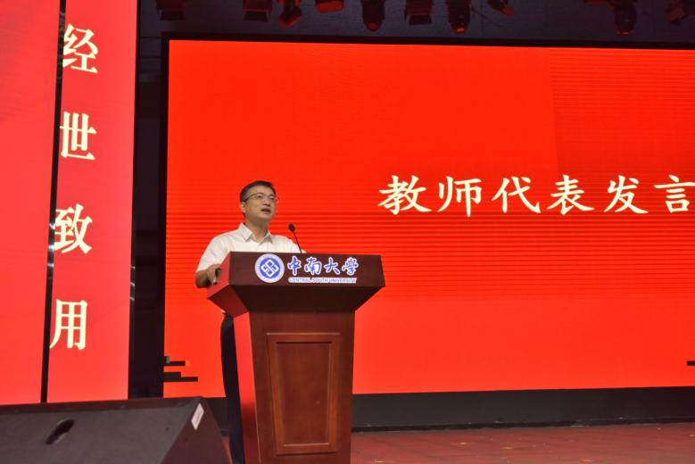 材料所元强老师作为教师代表兼 2021 级土木卓越班班导师发言。他回顾师生相处点滴,同时热烈祝贺毕业生开启新征程。他指出未来难免经历风雨,但只要心怀希望,每一次跌倒都是成长的契机,期许同学们永葆求知热忱,心怀家国,乐观豁达,以中南精神为帆,勇立时代潮头。