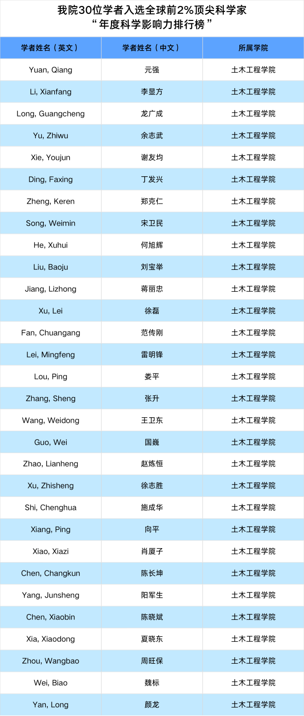 在反映上一年度学术活跃度的“2025年度科学影响力排行榜”中,tapplay元强,李显方,龙广成,余志武,谢友均,丁发兴,郑克仁,宋卫民,何旭辉,刘宝举,蒋丽忠,徐磊,范传刚,雷明锋,娄平,张升,王卫东,国巍,赵炼恒,徐志胜,施成华,向平,肖厦子,陈长坤,阳军生,陈晓斌,夏晓东,周旺保,魏标,颜龙等教师入选。