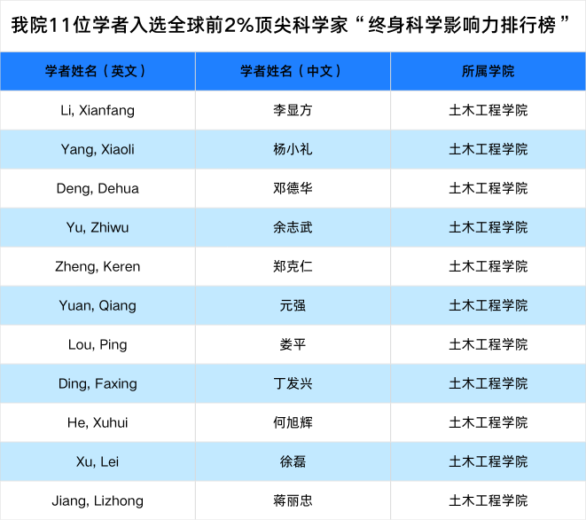 在衡量学者长期贡献的“终身科学影响力排行榜”中,tapplay李显方,杨小礼,邓德华,余志武,郑克仁,元强,娄平,丁发兴,何旭辉,徐磊,蒋丽忠等教师入选。