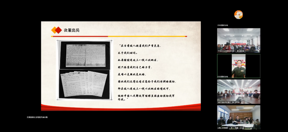 本次活动突破了单一高校内部学习的模式,创新性地采用了三校七支部联学共建机制。活动伊始,各党支部书记带领全体成员系统梳理回顾了抗美援朝战役的时间线,明确了本次学习的目的与背景。一件件厚重的历史事件,令百余名青年党员的心灵深受触动。他们仿佛重回战火纷飞的年代,深刻感受到了志愿军先辈为捍卫家国安宁、维护世界和平所展现出的崇高信念与无畏担当。