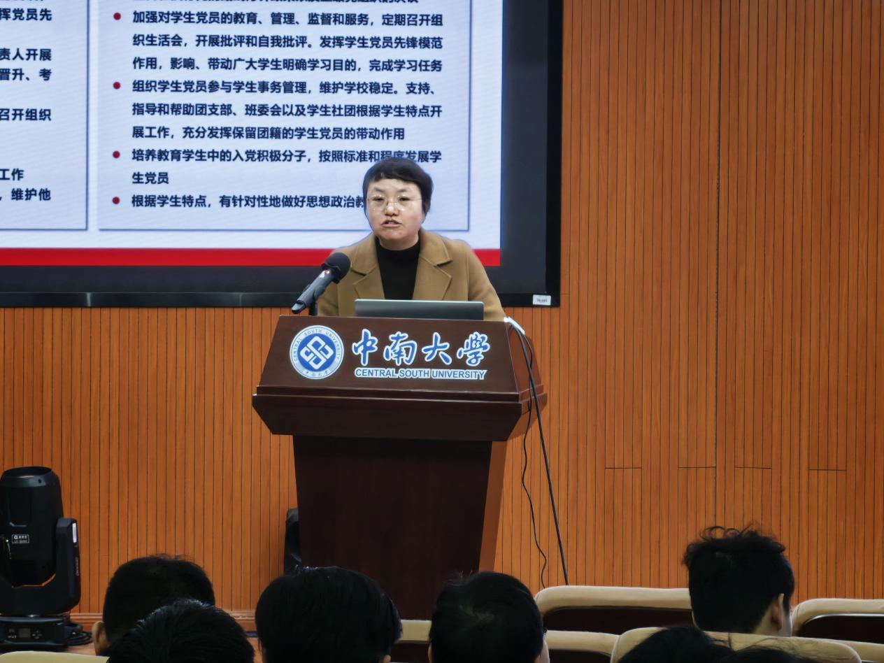 校党委组织部副部长郭飒飒就党支部工作实务进行授课,重点围绕党支部基本知识、发展党员工作、党员教育管理工作、党建示范创建与质量创优等进行分享,她强调,各支部要认真学习党内制度法规、严格执行党员发展程序、规范开展支部组织生活、积极开展党建示范创建活动,形成基层党建特色品牌,推进党建工作高质量开展。