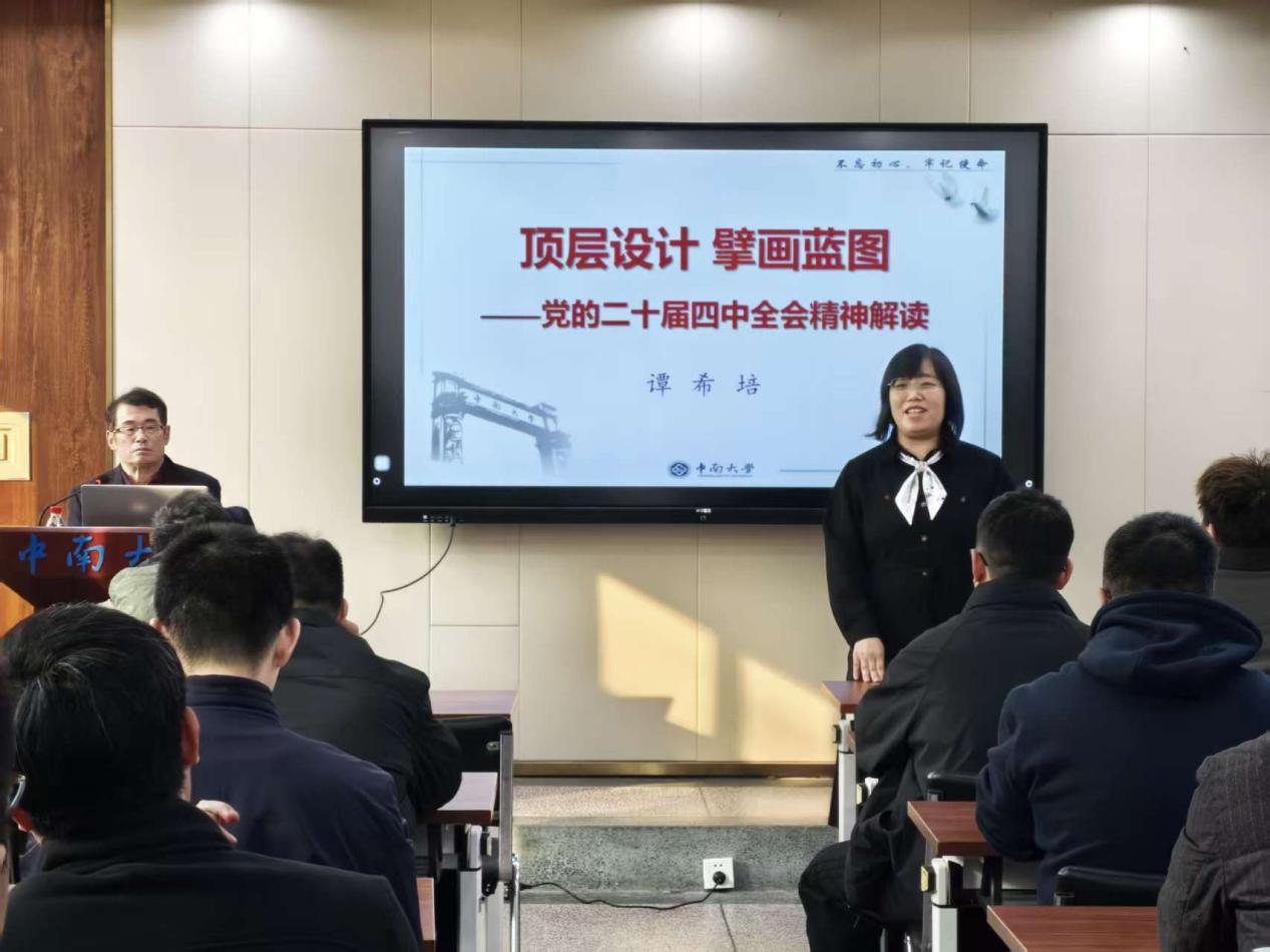 马克思主义学院原党委书记谭希培作题为《顶层设计 擘画蓝图——党的二十届四中全会精神解读》专题报告,解读习近平总书记在党的二十届四中全会上的重要讲话精神,解析全会的重大意义、“十四五”时期取得的伟大成就和“十五五”时期的重要地位、我国发展环境面临的深刻复杂变化,引导党支部书记切实将全会精神转化为更好服务保障个人履职的强大动力、具体举措和实际成效。
