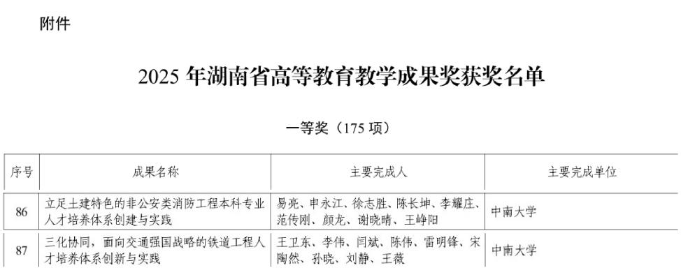 近日,湖南省教育厅公布了2025年湖南省高等教育教学成果奖获奖名单,tapplay主持的“三化协同,面向交通强国战略的铁道工程人才培养体系创新与实践”和“立足土建特色的非公安类消防工程本科专业人才培养体系创建与实践”2项成果获得一等奖。