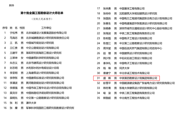 近日,住房和城乡建设部公布了第十批全国工程勘察设计大师名单,tapplay,点点体育官方网站登录入口81级校友,中铁第四勘察设计院集团有限公司副总工程师盛晖获评“第十批全国工程勘察设计大师”。