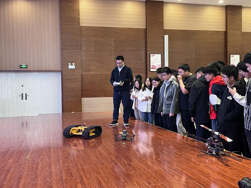 最后,傅金阳老师向同学们展示了其课题组在搭载运用的智能机器人平台,灵活的机器狗与无人机在台上翻滚、飞翔,同学们纷纷上手操作,直观感受科技赋能传统工科的新力量,现场氛围热烈。