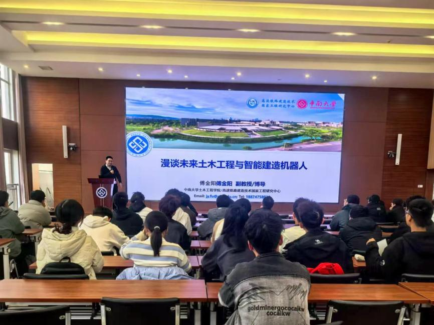 讲座伊始,傅金阳老师深入分析了智能机器人发展概况,重点介绍智能机器人的相关概念、发展历程以及其在土木行业应用的机遇与挑战,并结合土木工程智能化建造技术、未来土木工程技术、在研的智能检测机器人等方面具体工程案例深入浅出地带领同学们了解智能建造机器人在工程中的应用现状及未来土木工程“机械化+智能化”的时代展望。