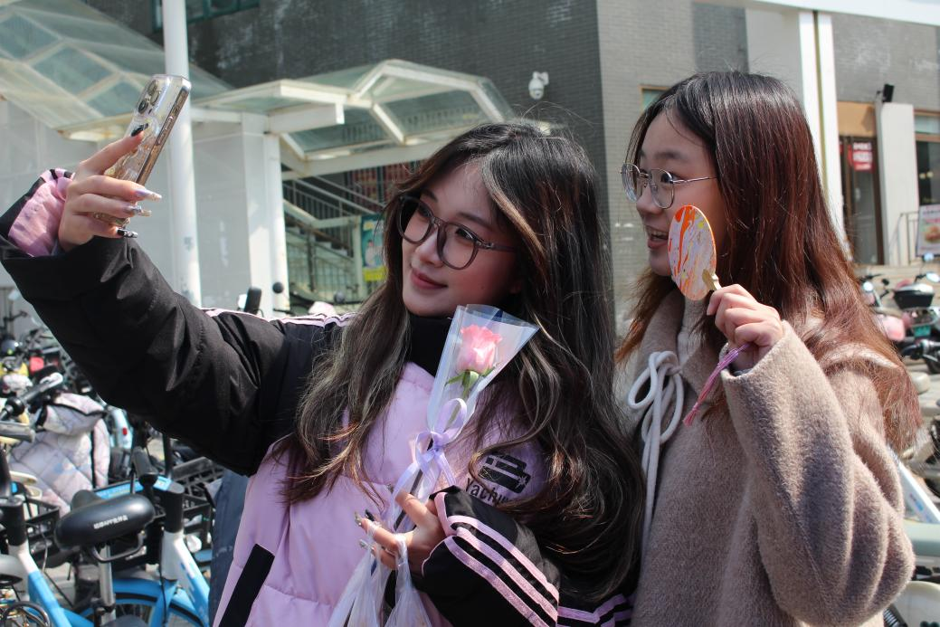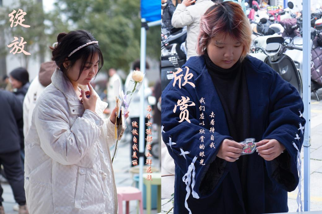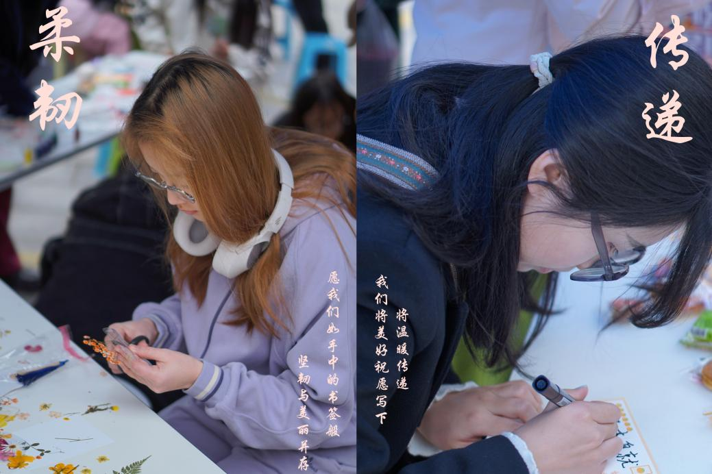 在活动主会场,工作人员精心准备了干花书签、漆扇、鲜花、手串制作材料以及精美锦囊。随着同学们陆续到场,大家纷纷开始挑选心仪的鲜花,并在节日横幅上写下真挚的祝福,共同庆祝这一属于全体女生的节日。在干花书签和漆扇制作摊位前,同学们热情参与,亲手创作出独一无二的作品,用巧思与创意定格美好瞬间,为这个如花般绚烂的世界留下珍贵的纪念。