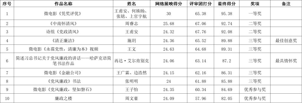 经过学院有关职能部门代表、院内外专业人士组成的评审团与网络展映统计得分,本次大赛评选出一等奖1名、二等奖2名、三等奖5名。基于以上评分,依据内容创新得分、画面音效得分与主题契合度得分,综合评选出最佳创意奖与最具情怀奖各1名。获奖情况具体结果见下表。