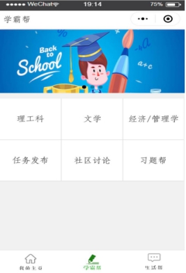 “学霸帮”主要能够完成社区交流、问题解答以及答案查询。主要功能在页面中展示,选择学科后,可以进行问题的发布以及对问题类型的筛选。在建的“习题帮”主要想把主要学科的课后答案收集起来,方便同学们课后的学习,同时也为小程序的推广带来有利影响。