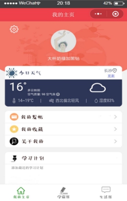 “我的主页”界面主要借鉴了“知乎”上小程序开发社区中“极乐君”对天气程序的代码构思并改变了一定的排版,使得界面更为美观。同时加入简易的学习计划便签,希望能让更多同学能进入程序就看到当初制定的计划,不忘初心。