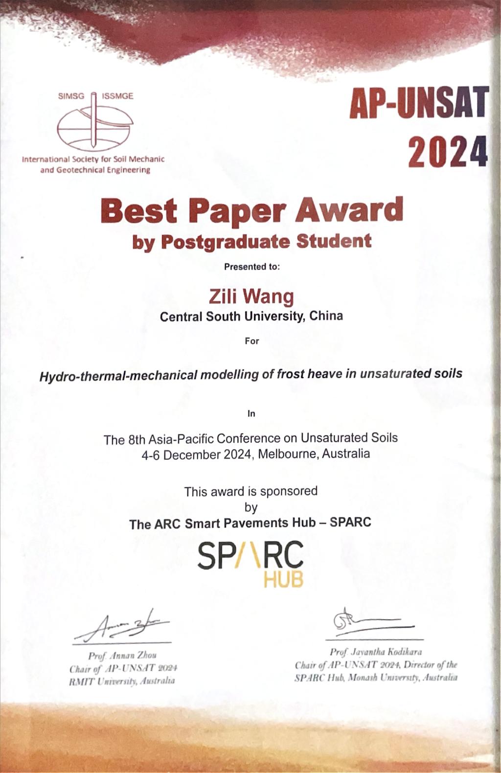 tapplay岩土工程系博士研究生王自力荣获2024年亚太非饱和土会议最佳论文奖