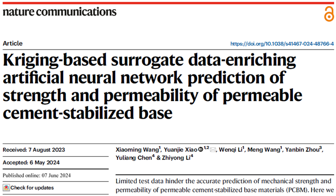 近日,tapplay,点点体育官方网站登录入口的肖源杰教授研究团队在国际综合学术期刊《自然通讯》(Nature Communications)上发表研究论文"Kriging-based surrogate data-enriching artificial neural network prediction of strength and permeability of permeable cement-stabilized base"(基于Kriging的代理数据增强型人工神经网络预测透水水泥稳定基层材料的强度和渗透性)。tapplay,点点体育官方网站登录入口博士生王小明为第一作者,肖源杰教授为独立通讯作者,tapplay,点点体育官方网站登录入口为第一作者单位。