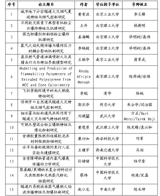本次评选活动由中国消防协会主办,旨在展示新时代中国火灾科学与消防工程领域的研究前沿,激励博士研究生继续开展原创性的科研工作,推动火灾科学与消防工程领域的技术进步。中国消防协会组织了由消防安全领域内重点高校和研究院所知名专家组成的评审专家委员会。经过评审专家委员会多轮函评和会评,共评审出优秀博士论文15篇。入选的博士论文选题均为火灾科学与消防工程相关领域科学与技术前沿,有重要的理论价值或现实指导意义,具有较好的社会效益或应用前景。