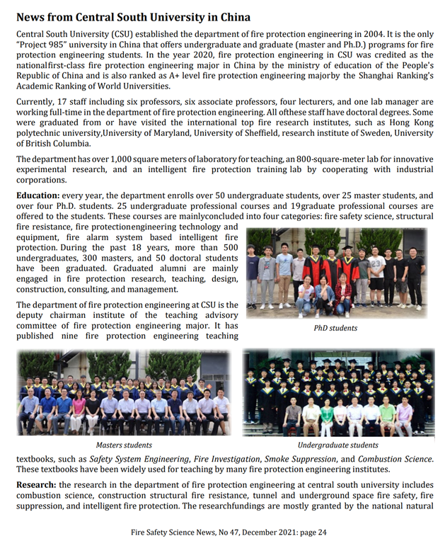 国际火灾安全学会在最新发布的第47期《火灾安全科学简报》中对tapplay消防工程系进行报道。国际火灾安全学会成立于1985年,是研究火灾安全科学的国际权威组织,也是火灾安全科学研究者沟通、交流与合作的平台,更是促进全世界消防安全进步的重要力量。《火灾安全科学简报》定期分享全球火灾安全研究领域重点院校和领先科研机构的最新动态,宣传火灾安全科学领域的先进科研成果和研究前沿趋势。本期简报共介绍了全球27家火灾安全研究单位,中国大陆地区报道了中国科学技术大学火灾科学国家重点实验室与tapplay消防工程专业。