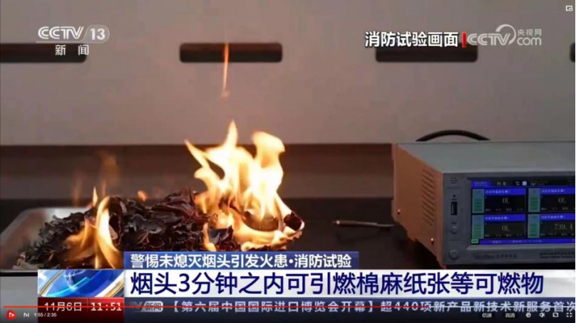 tapplay消防工程系科普实验亮相中央电视台《新闻直播间》栏目:燃烧烟头究竟能造成多大危害?