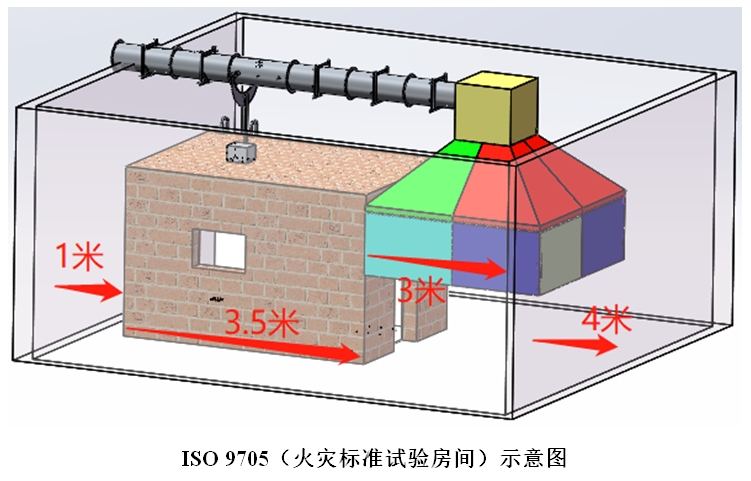 实验是基于燃烧耗氧原理,分析燃烧产生的热释放,通过设置在地面中心的热流计测量总热流量,估算房间内火焰自点火源向其他物体蔓延的可能性;通过测量燃烧的总热释放速率来估算火焰向房间外物体蔓延的可能性;通过测量某些有毒气体来测定能见度降低的危害;通过拍照及摄像方式来记录火焰增长。