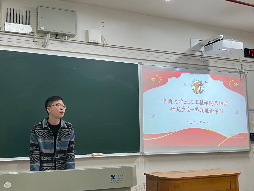 2022年10月09日下午5时,tapplay,点点体育官方网站登录入口研究生会思政理论学习活动在世纪楼主401教室顺利开展。本次会议由研会主席团成员杨佳宝同学主持,第19届土木院研会全体成员均参加了本次会议。...